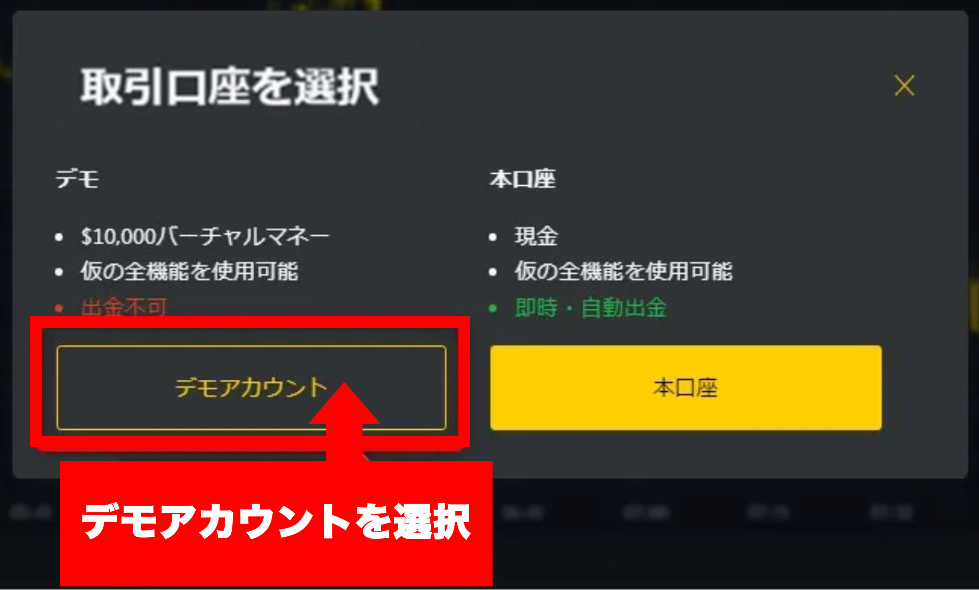 - 取引口座で「デモアカウント」を選択する(上画像)