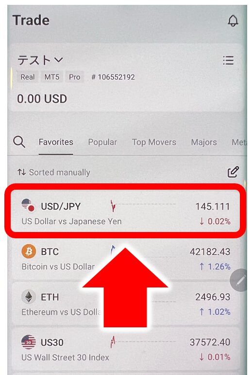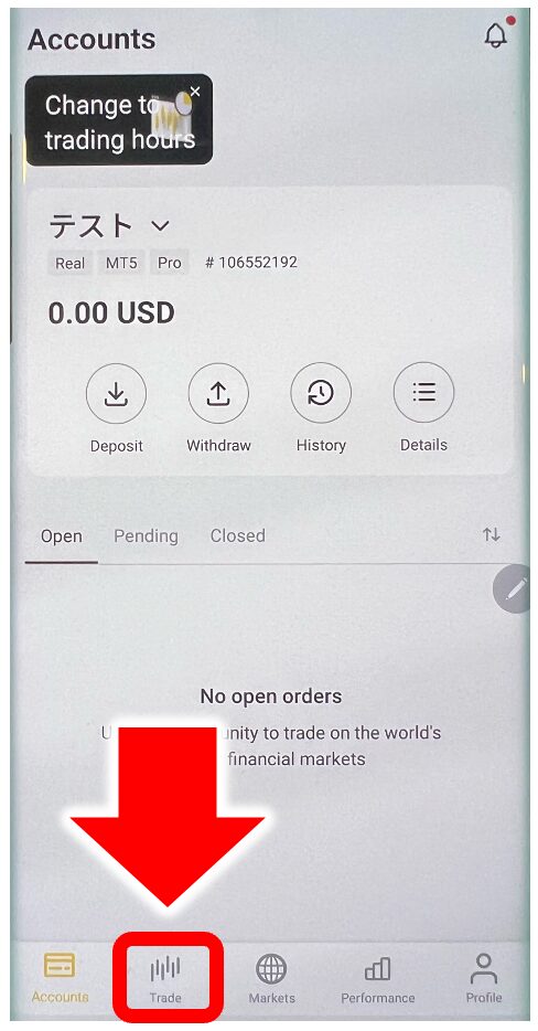 ログインしたら、画面下部の「Trade(取引)」をタップします。