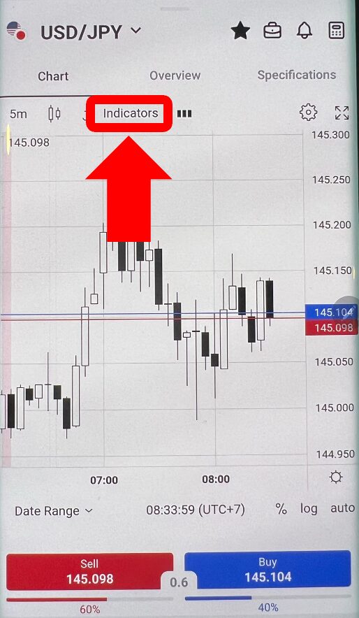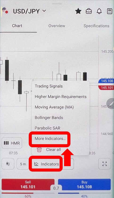 画面下に表示されている「Indicators(インジケーター)」をタップして、「More Indicators(より多くのインジケーター)」を選択します。