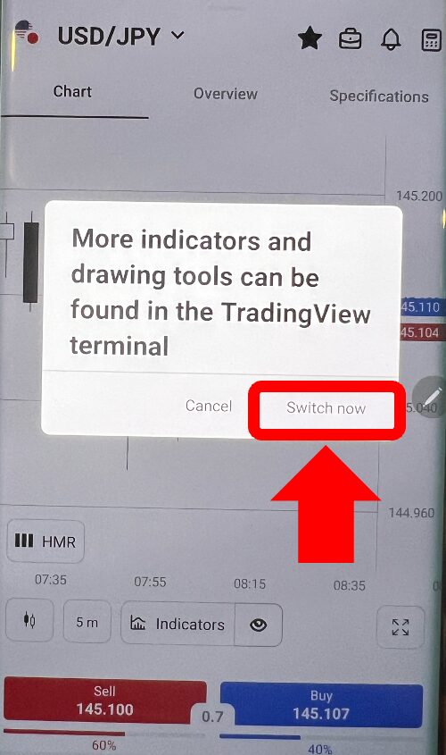 TradingViewのターミナルを使用するか?という確認メッセージが表示されるので「Switch now」をタップします。