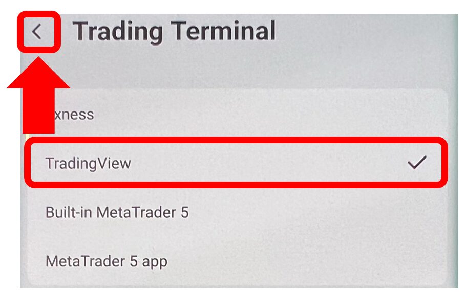 ターミナル選択画面が表示されるので、「TradingView」を選択してから画面左上の左矢印をタップして戻ります。