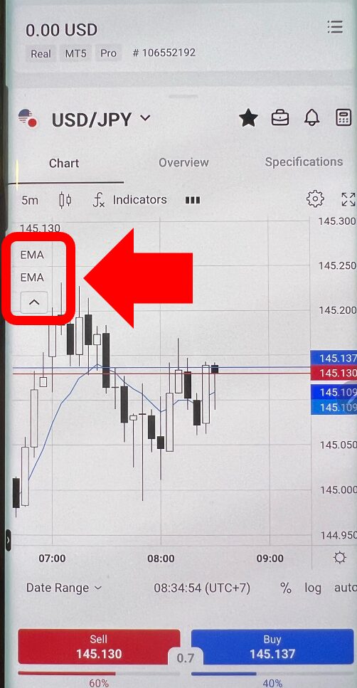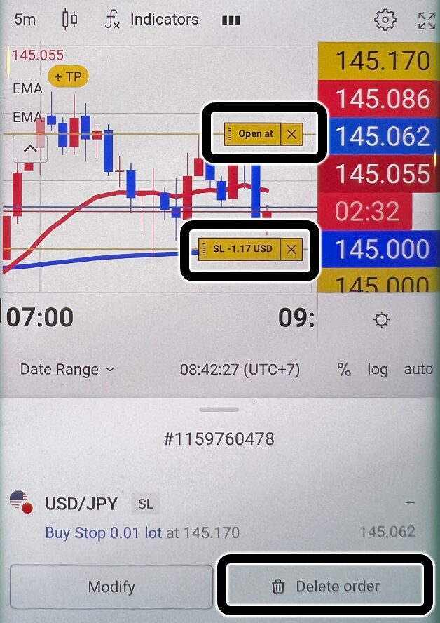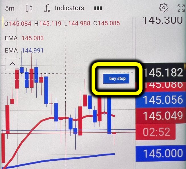 チャート画面上に「Buy Stop」が表示されれば、「逆指値の買い注文」を問題なく予約できていることが確認できます。