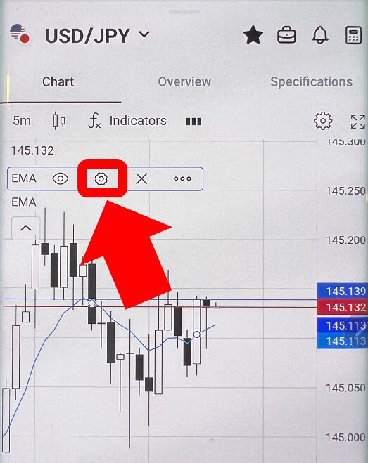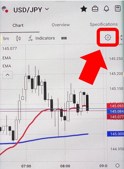 チャート画面の左上に表示されている「歯車マーク」をタップします。