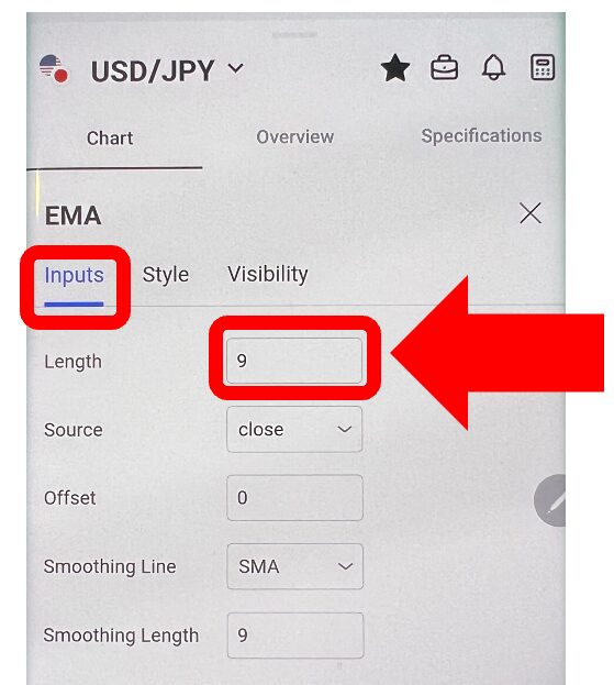 「Inputs(インプット)」のタブを開いて、「Length(期間)」にそれぞれ「20・200」と入力します。