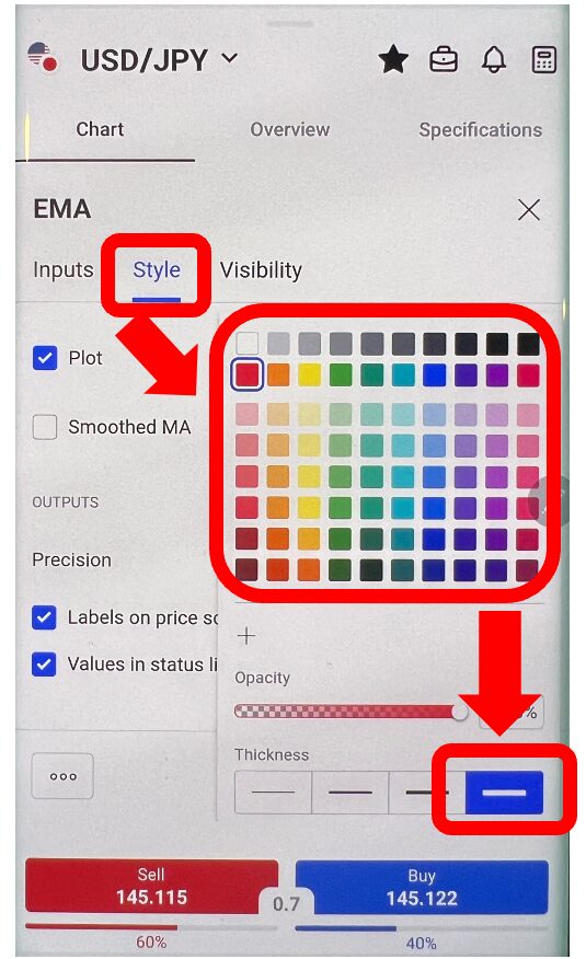「Style(スタイル)」ではEMAの色・太さ・線のデザインなどを設定できます。