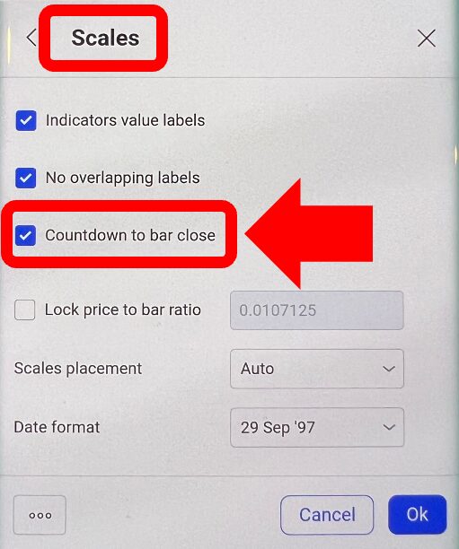 「Scales(スケール)」を開いて、「Countdown to bar close」にチェックを入れます。