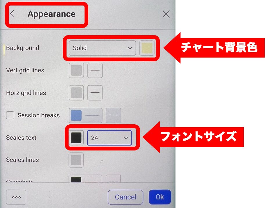 「Appearance(外観)」では、チャート画面の背景色・フォントサイズなども変更できます。