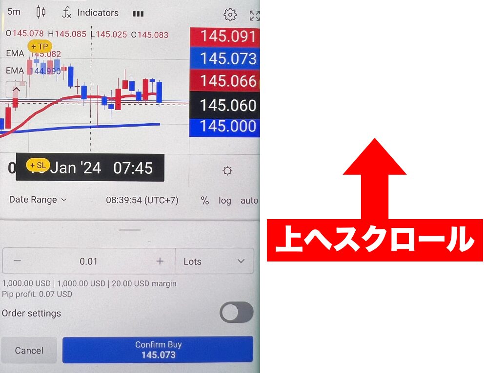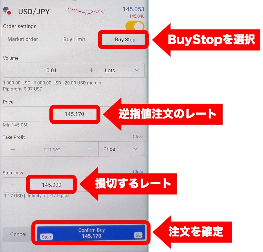 問題なくレート設定ができたら、画面一番下の「Confirm Buy(逆指値買い注文を確定する)」をタップすれば完了です。