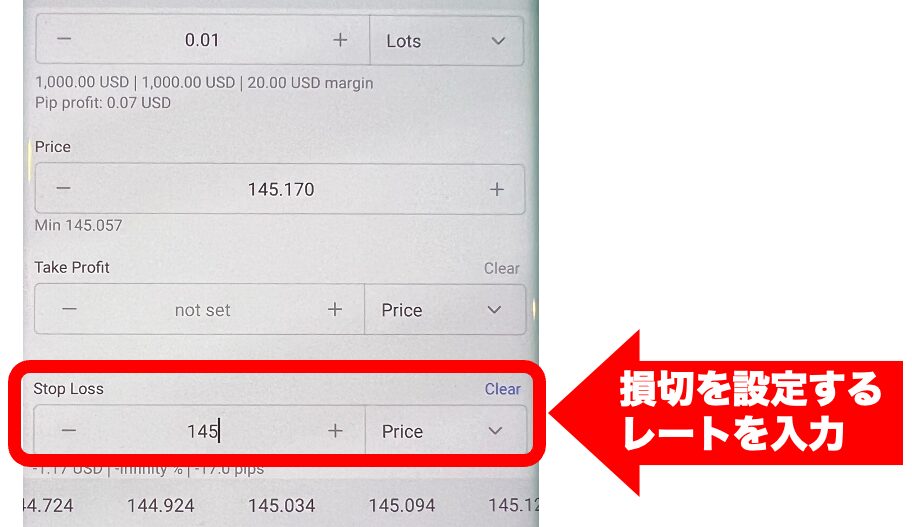 続いて、「Stop Loss(損切)」するレートを設定します。