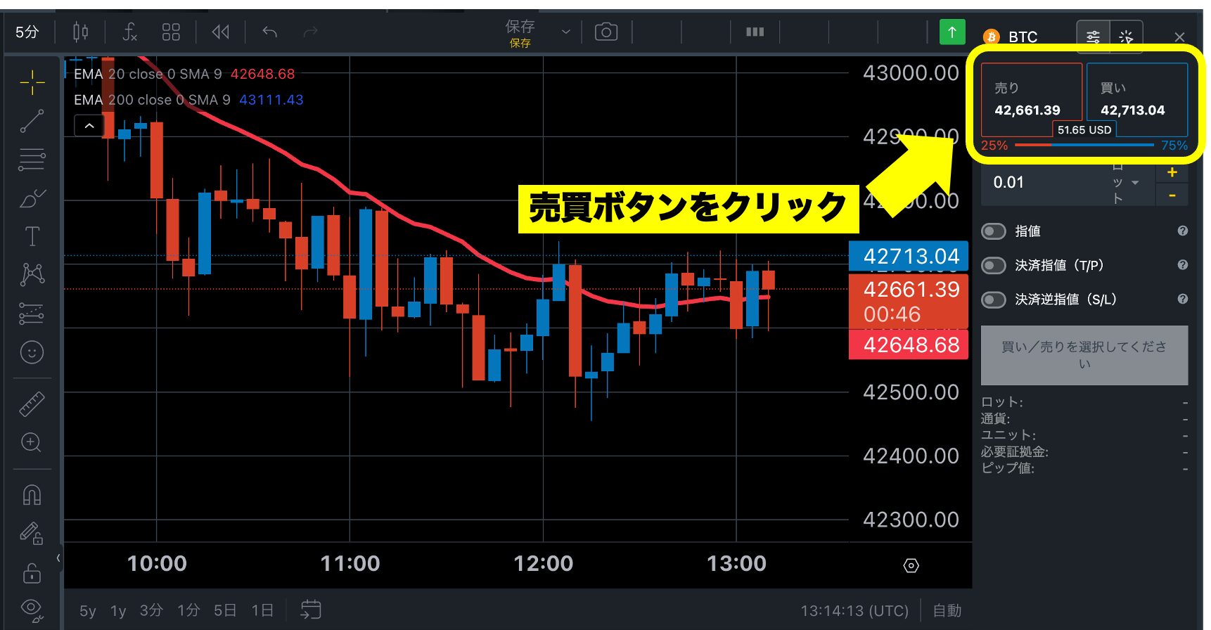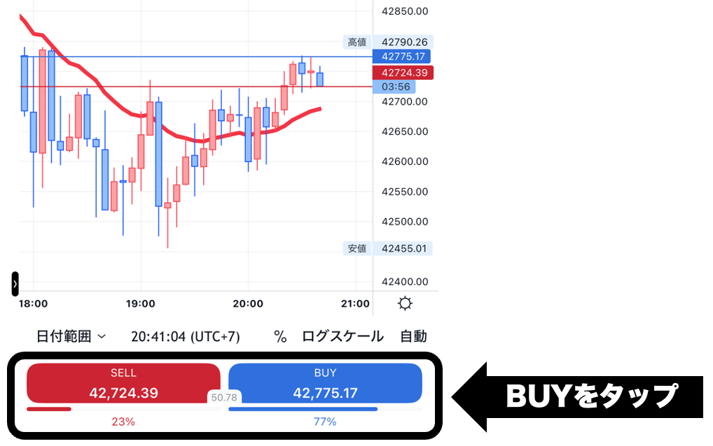 まず取引画面を開いたら、画面下に表示されている売買ボタンをタップします