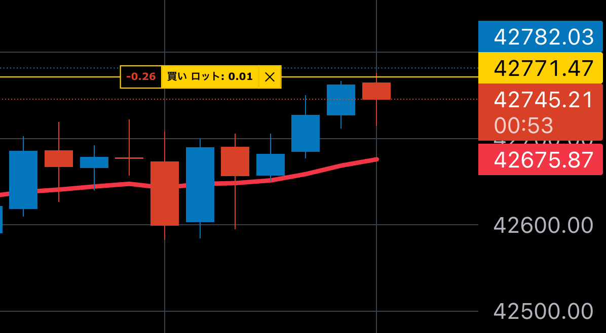 注文が通ると、画面上に注文したレートで横線が表示されて収支も確認できるようになります。