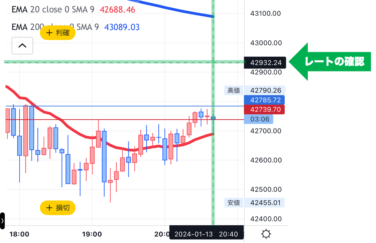 チャート上を「長押しタップ」すると、上記のようにタップしている部分のレート・日時などを確認できます。