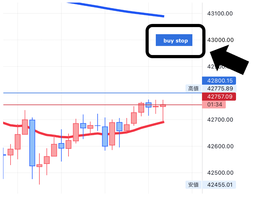上記のようにチャートに「BuyStop」と表示されていれば、問題なく注文できていると確認できます。