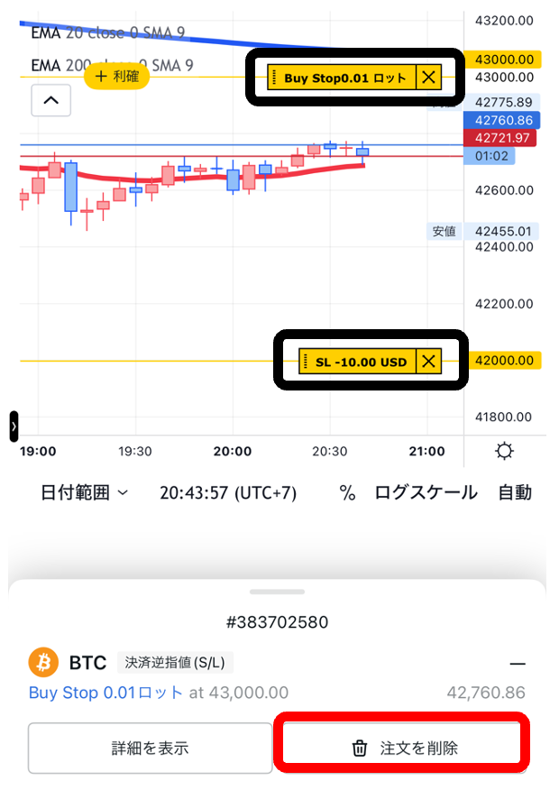設定した逆指値注文をキャンセルしたい場合には、「BuyStop」の部分をタップします。