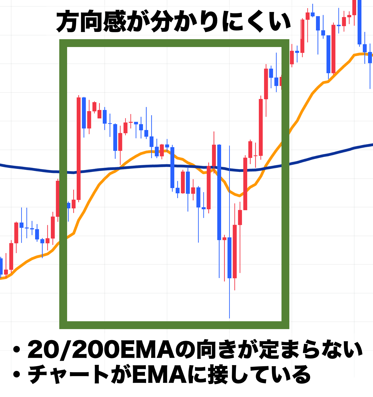このように、20EMA・200EMAがサポートもしくはレジスタンスとして機能することがよくあり、それまでの流れを一旦ストップさせたり、進む方向を変えることもあります。