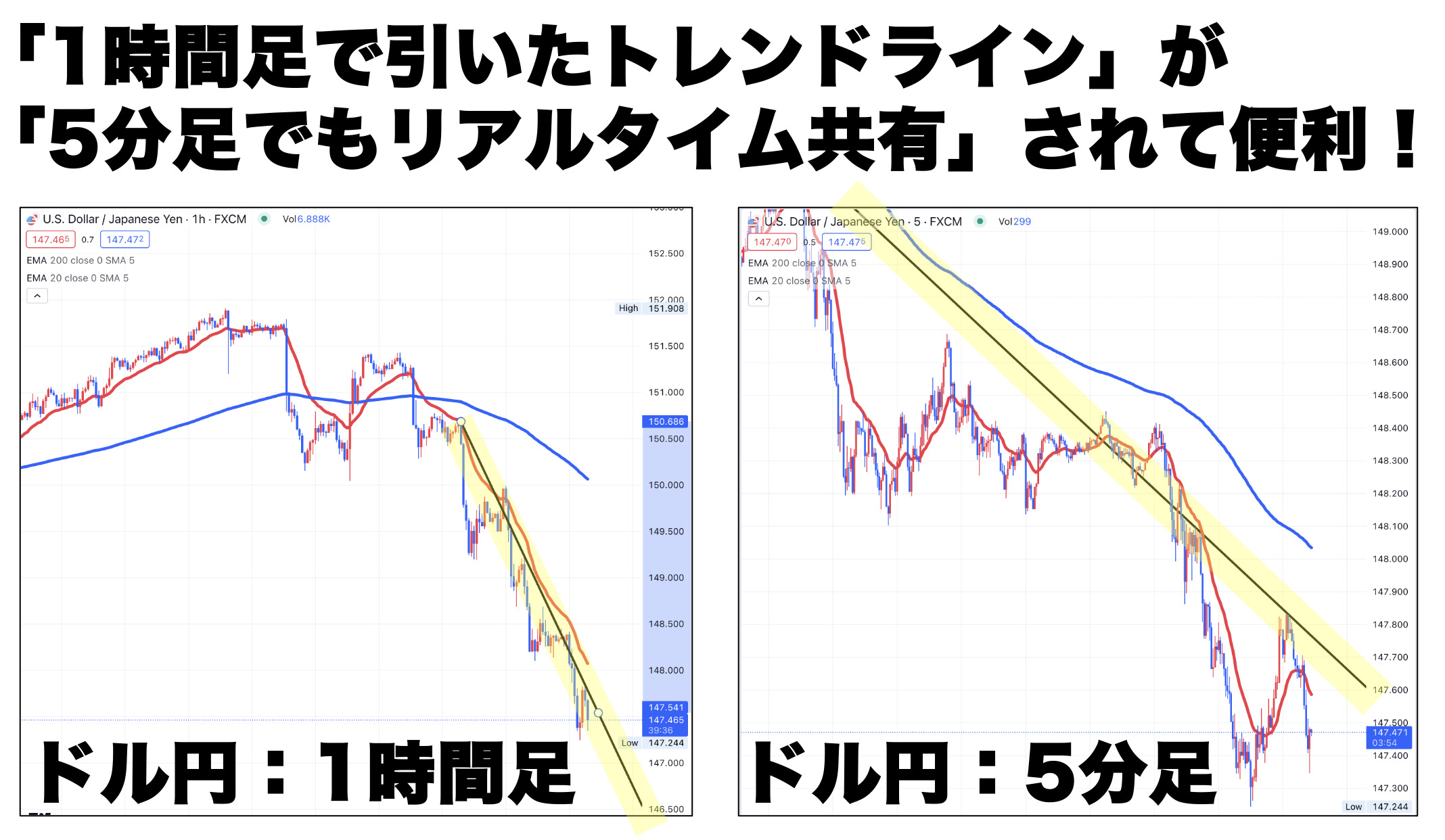 たとえば、ドル円でチャート分析する際に「5分足チャートと1時間足チャートを同時に表示」させることなどもできます!