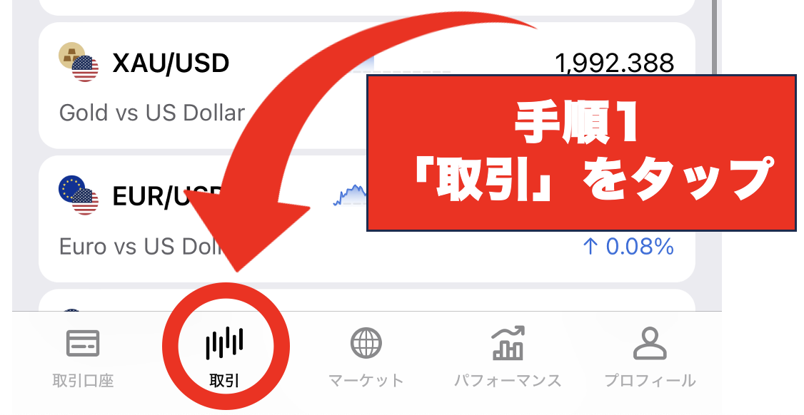 まずExnessアプリを開いたら、画面下に表示されているタブから「取引」をタップします。