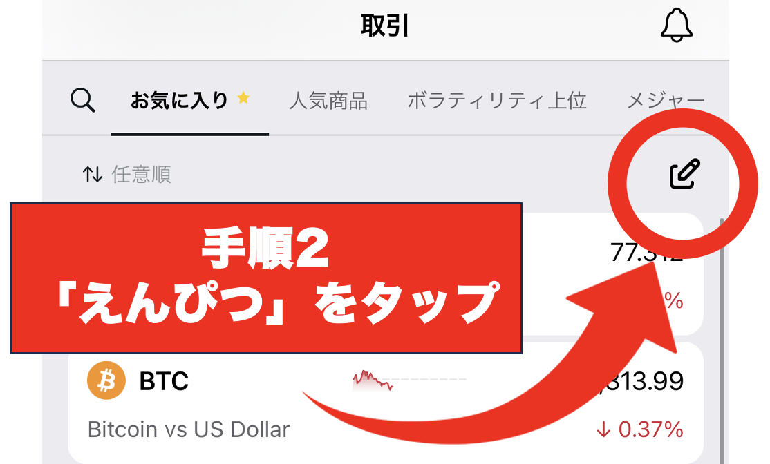 取引タブを開いたら、右上に表示されている「えんぴつマーク」をタップします。