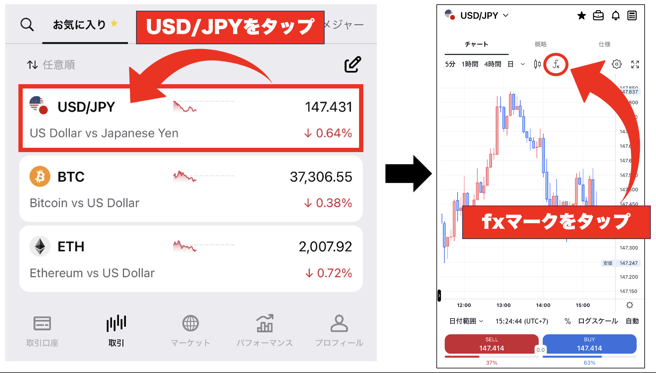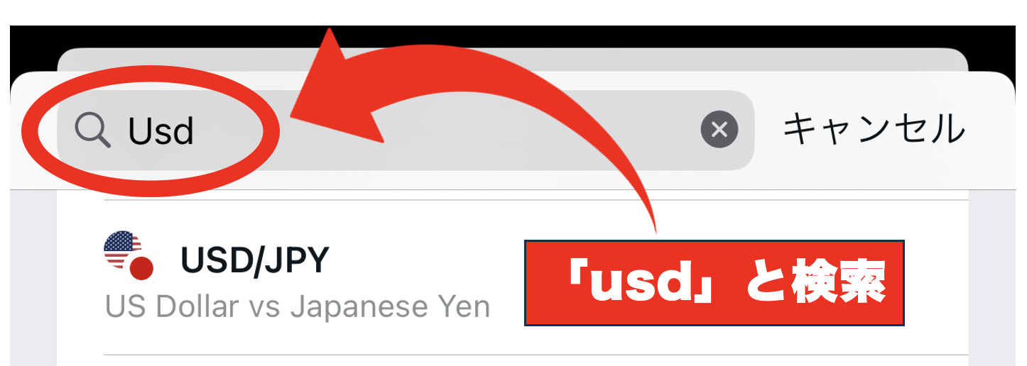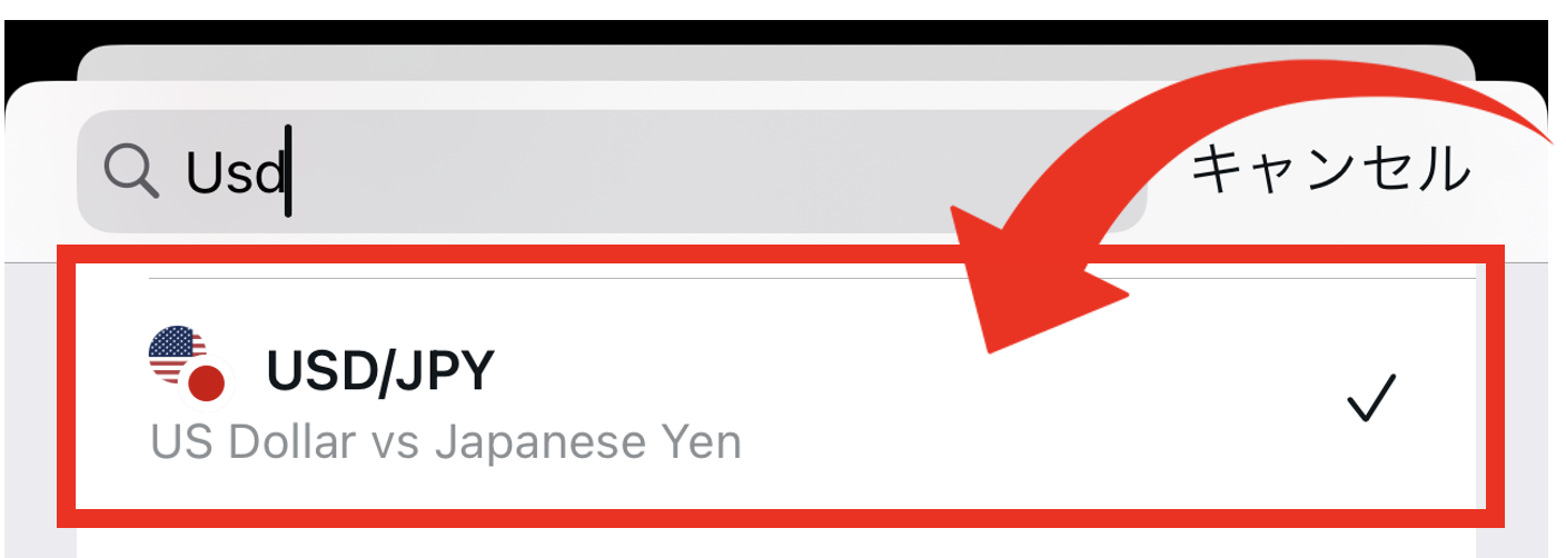 今回は「ドル円」のチャートに追加したいので、「USD/JPY」をタップしてください。