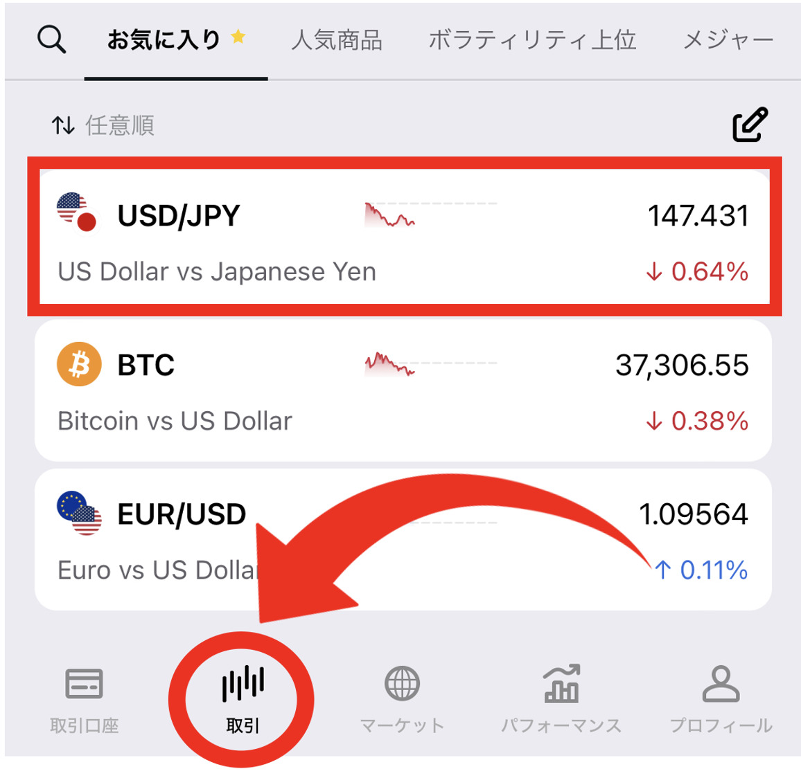 取引タブの「お気に入り」に「USD/JPY」が追加されれば、「ドル円の追加」は完了です!