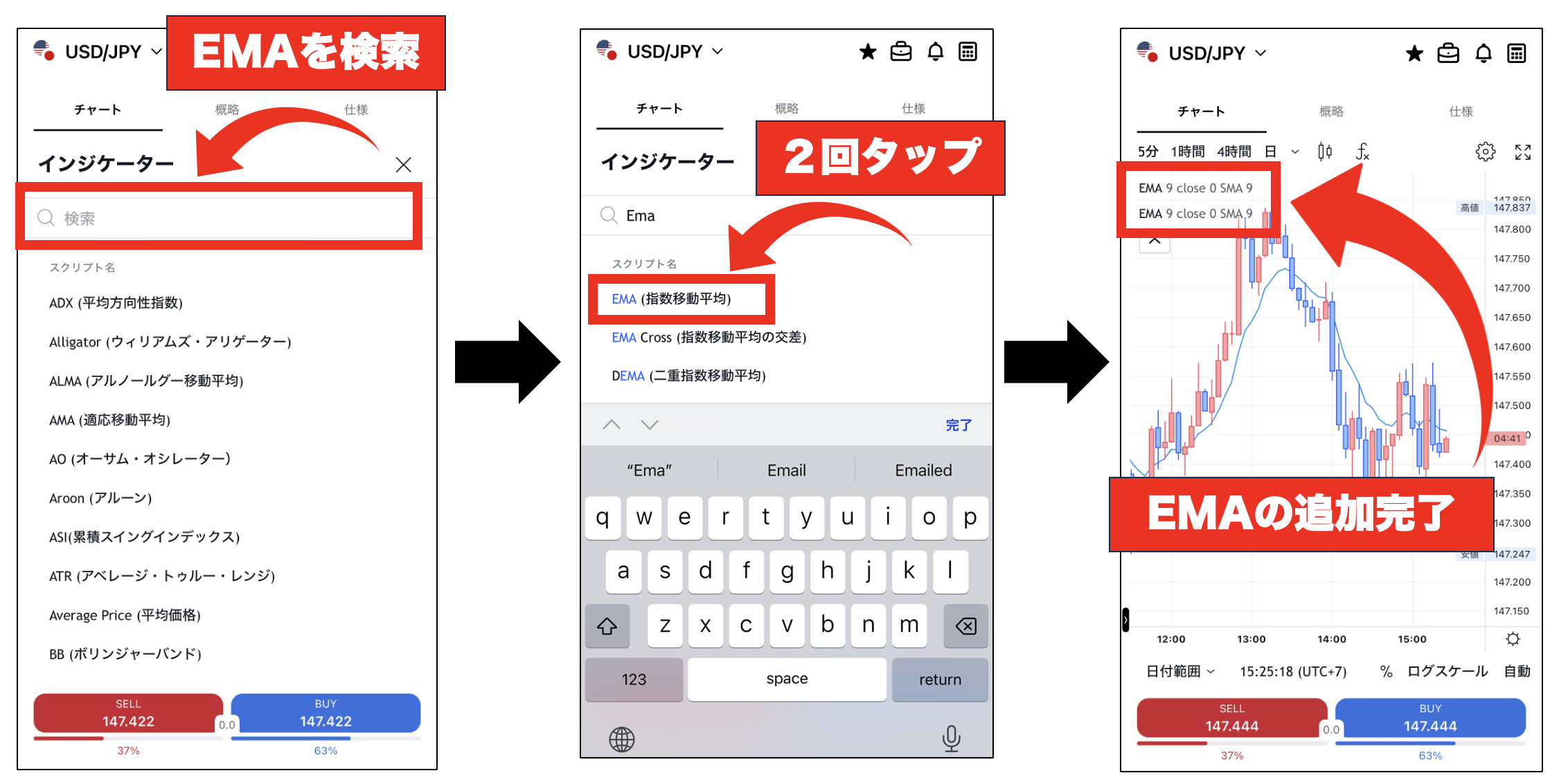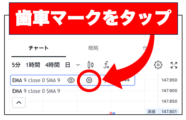 今回は20EMA・200EMAの2つを追加するため、時間を空けて2回タップしてください。