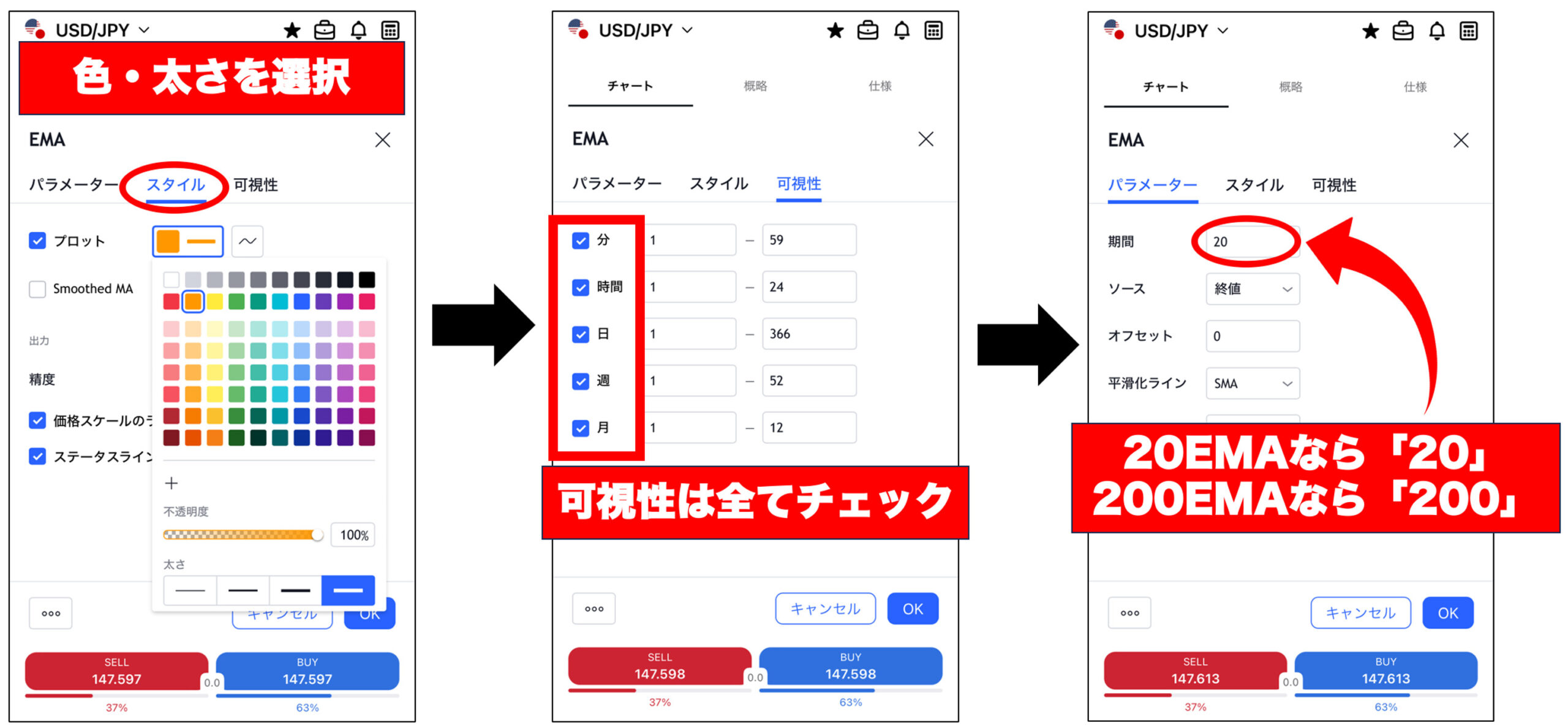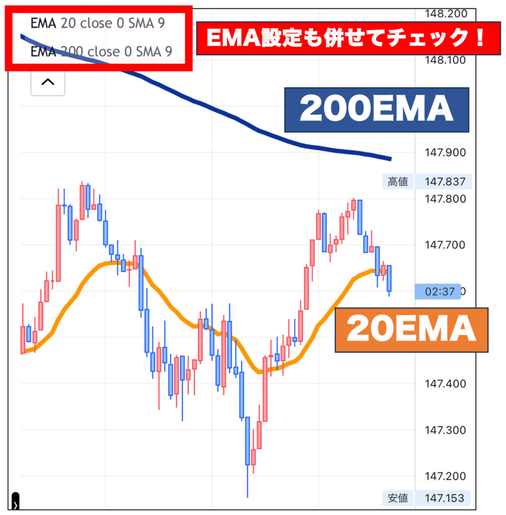また「可視性」にチェックを入れることで、同じ通貨ペアであれば「全ての時間足」で20EMAと200EMAが表示されるようになり便利です。