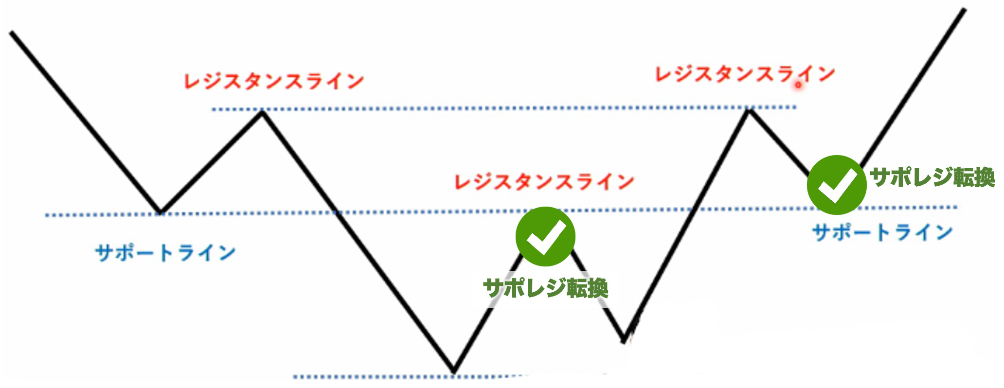 そして、今までサポート・レジスタンスとして機能していたラインや価格帯をチャートが突破した場合、それぞれの機能が反転する「サポレジ転換」をすることになります。