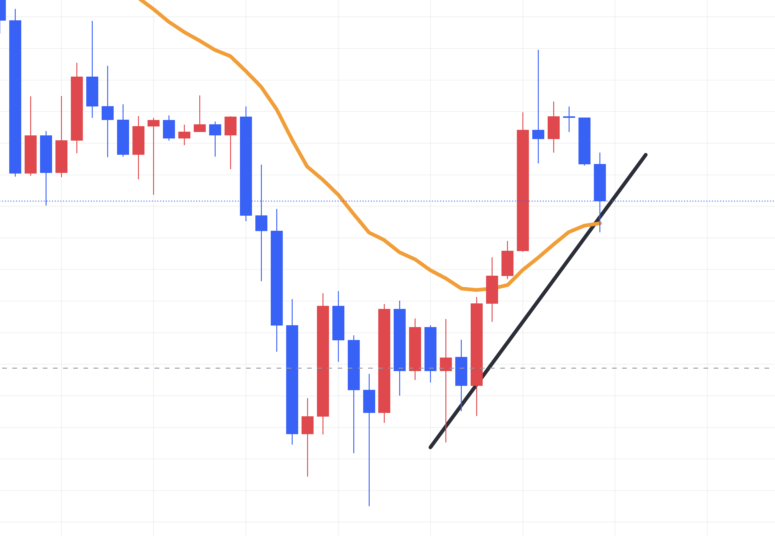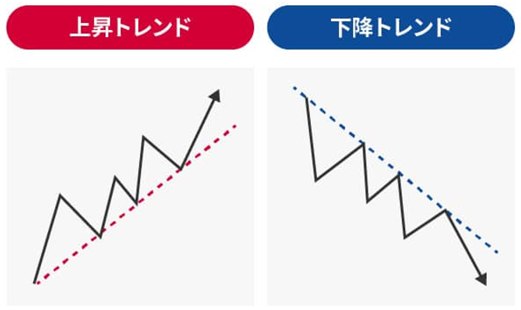 トレンドラインには、上昇トレンドラインと下降トレンドラインがあり、トレンドラインを引くことでチャートの方向性や価格が反発しそうなタイミングを見つけやすくなります。