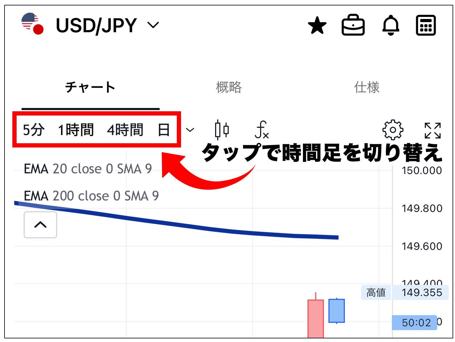 ちなみにExnessアプリでは、画面左側に表示される「時間」をタップすることで、その時間足にチャートを切り替えられます。