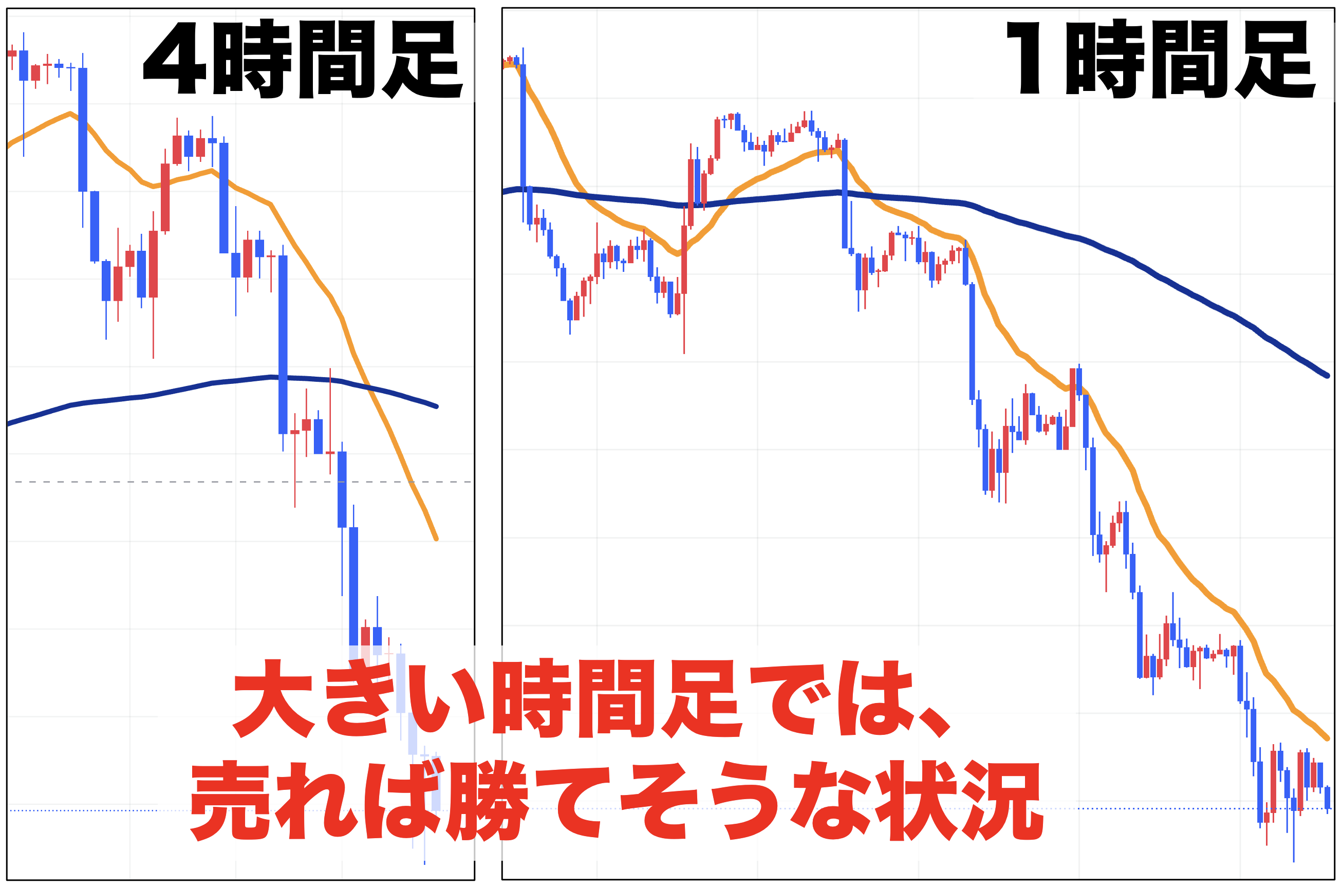 たとえば、大きい時間足が「売れば勝ちやすそうな状況」であれば、