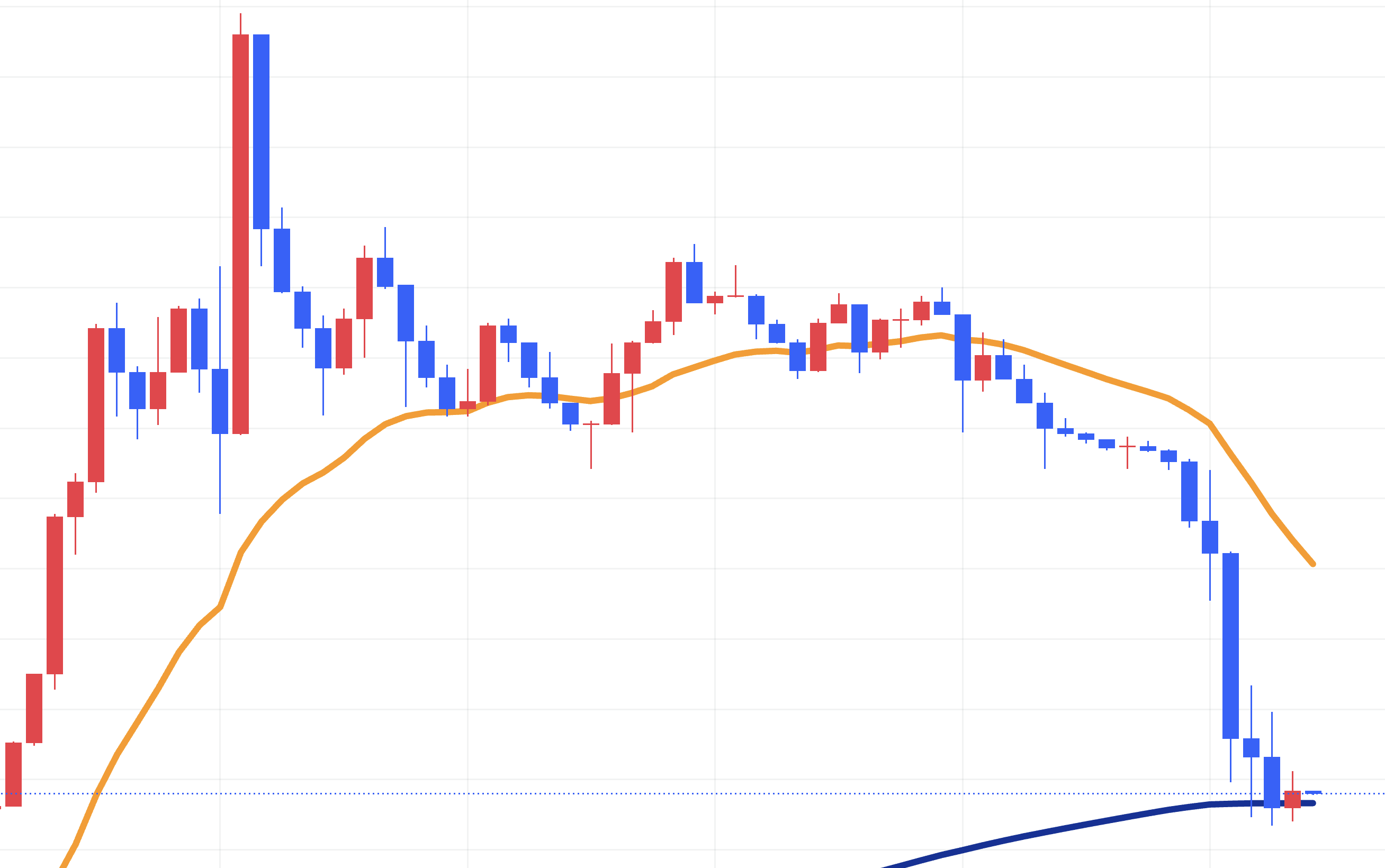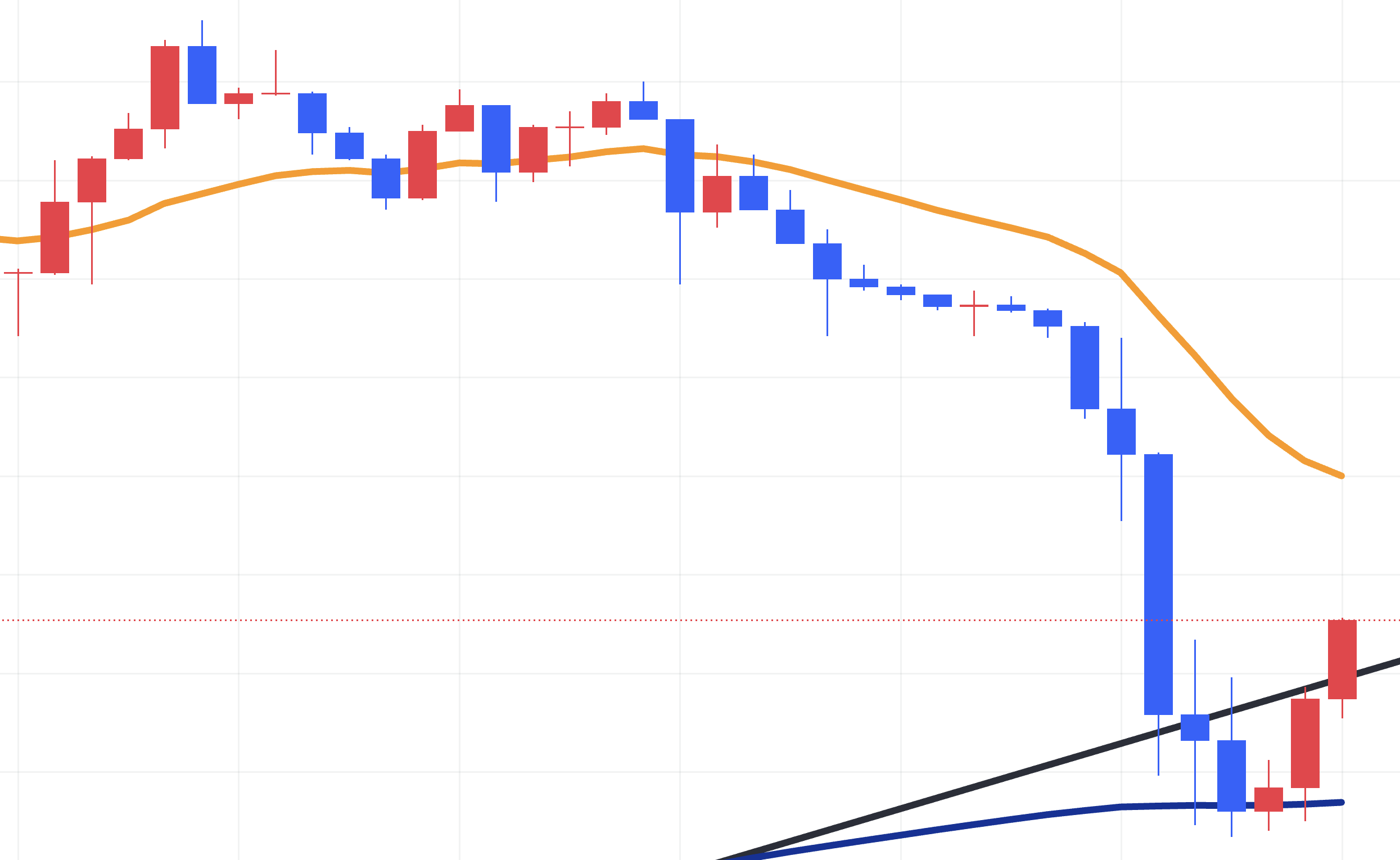 たとえば、上記の画像は200EMAがサポートとして機能して一旦下落がストップした状況になります。