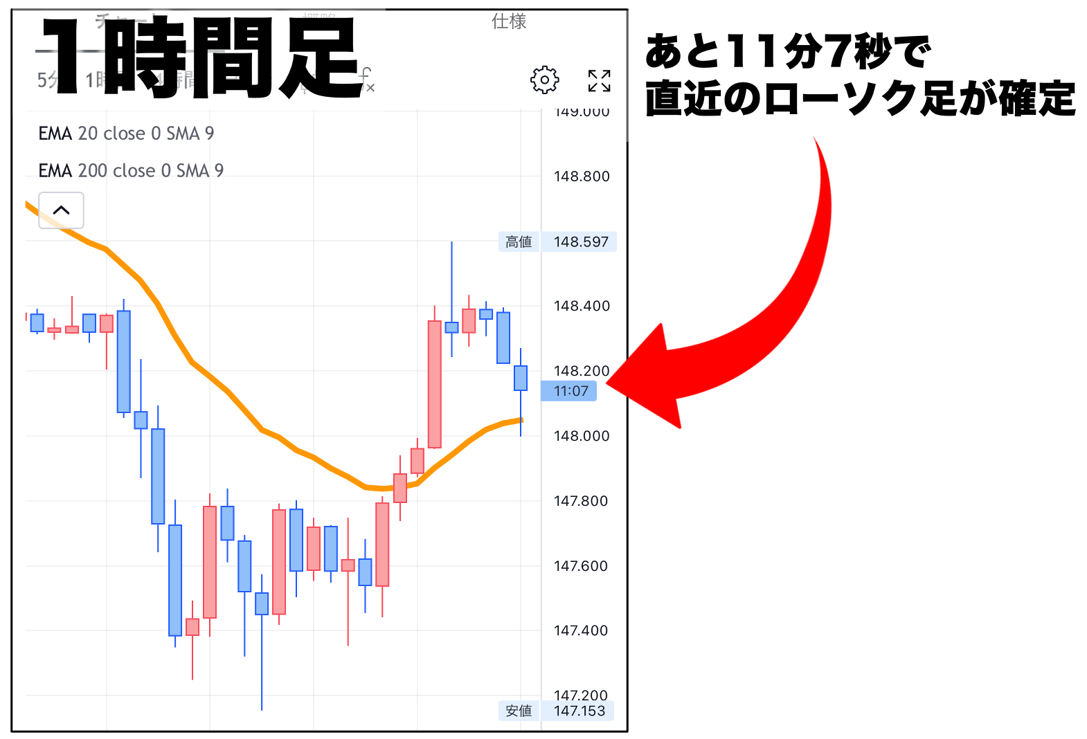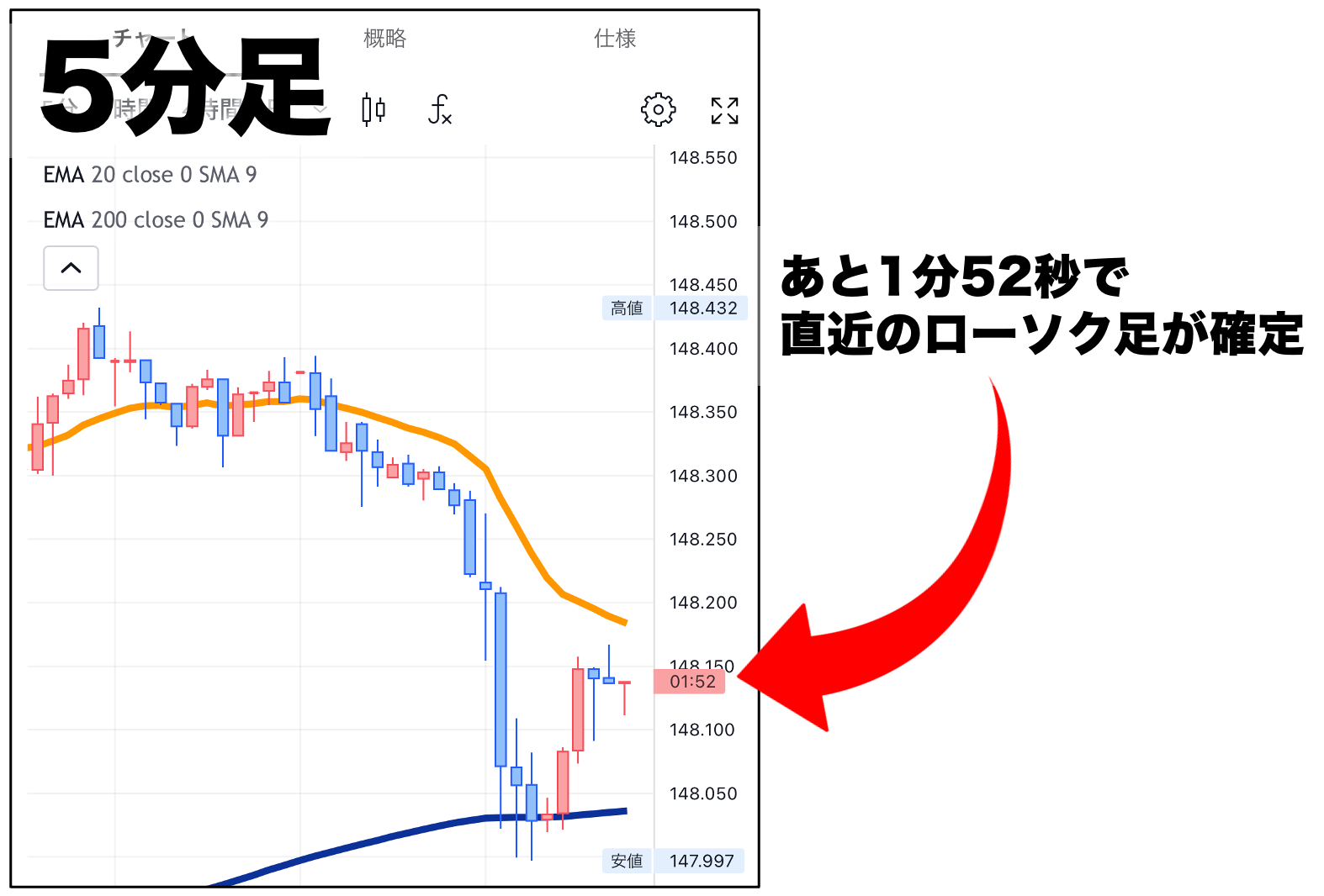 上記のチャートを見ていただくと、あと1分52秒で直近のローソク足が完成することがお分かりいただけます。