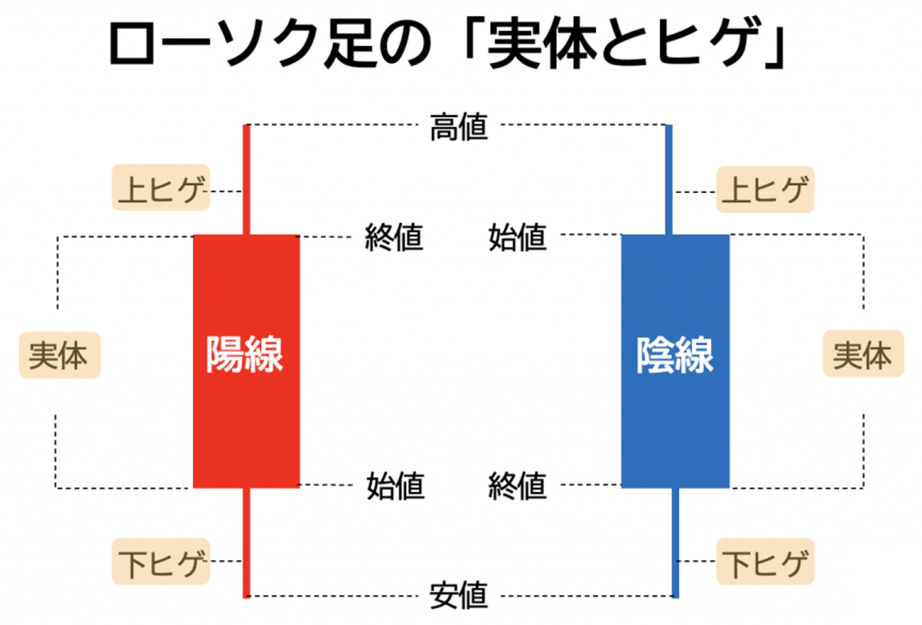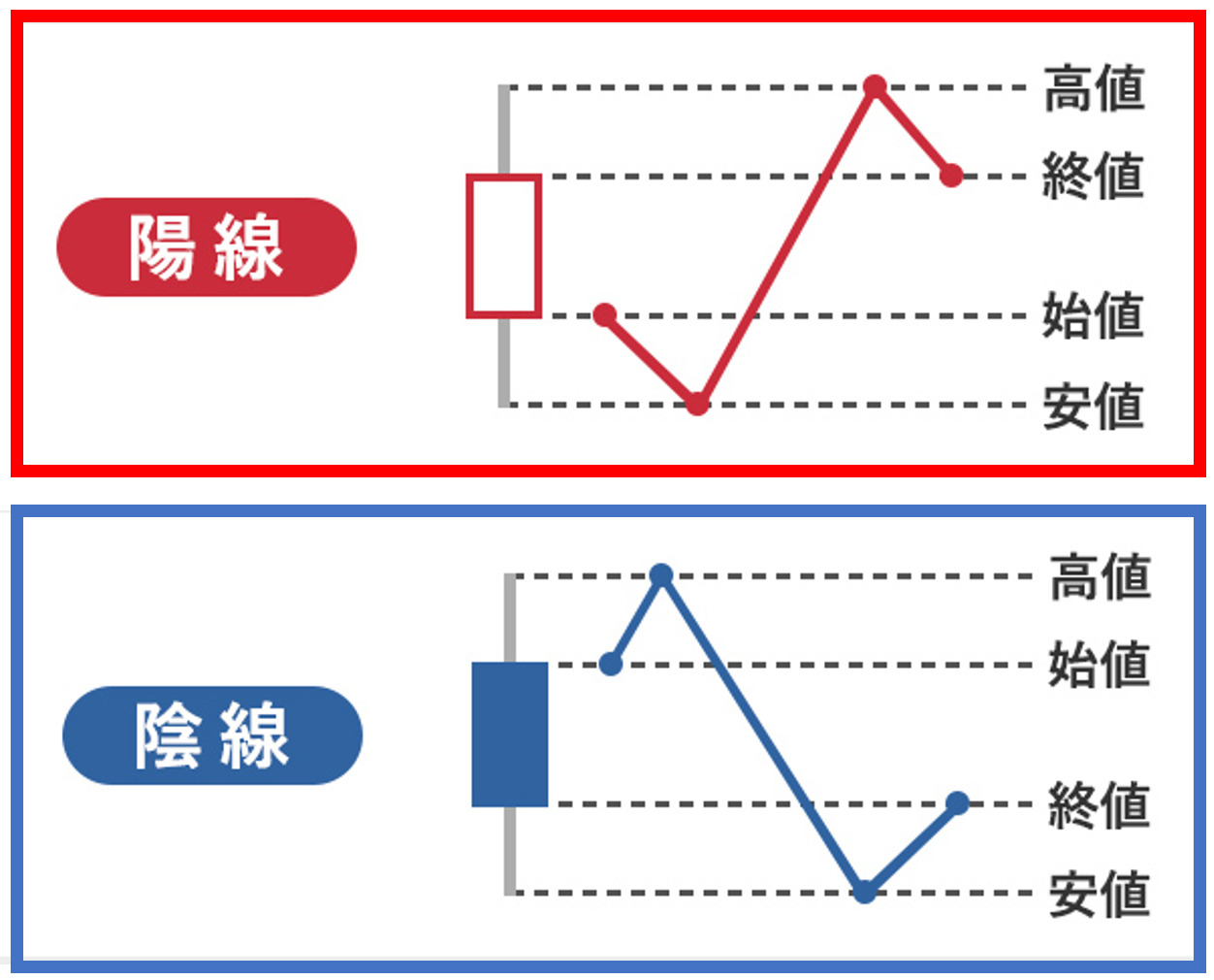 加えて、始値が終値よりも低いローソク足を「陽線」、始値が終値よりも高いローソク足を「陰線」と呼びます。