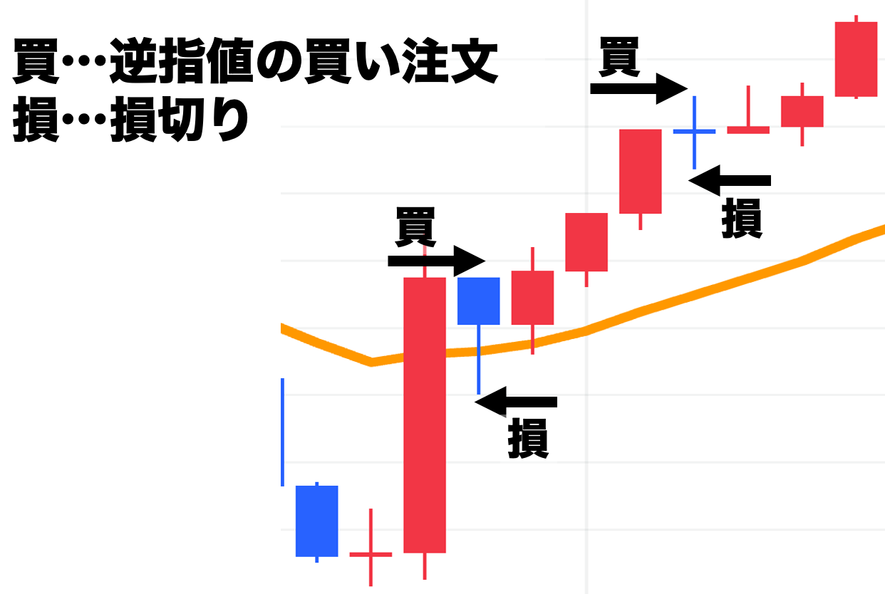 実際のチャートを見てみると、上記のようなタイミングで買い注文ができるイメージです。