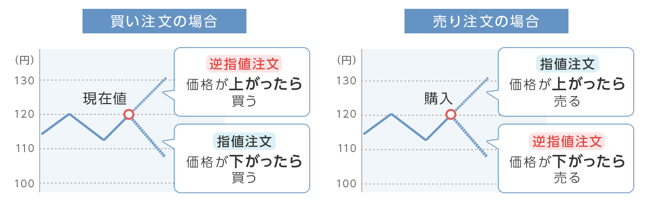 簡単に説明すると、現在の価格よりも不利な価格で注文を出すことが「逆指値注文」となります。