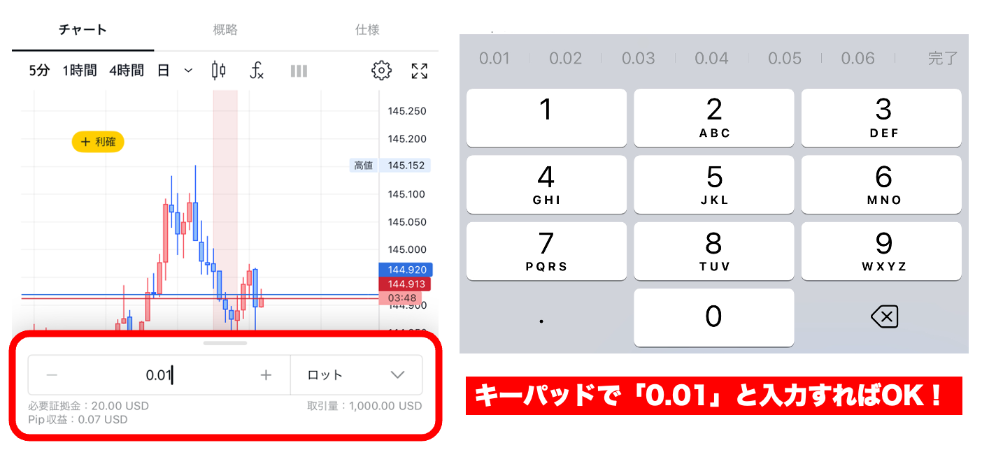 まず基本的なトレードの流れがわからない段階でしたら、リスクを最小限に抑えるために絶対に「0.01」からトレードを始めるようにしてください。