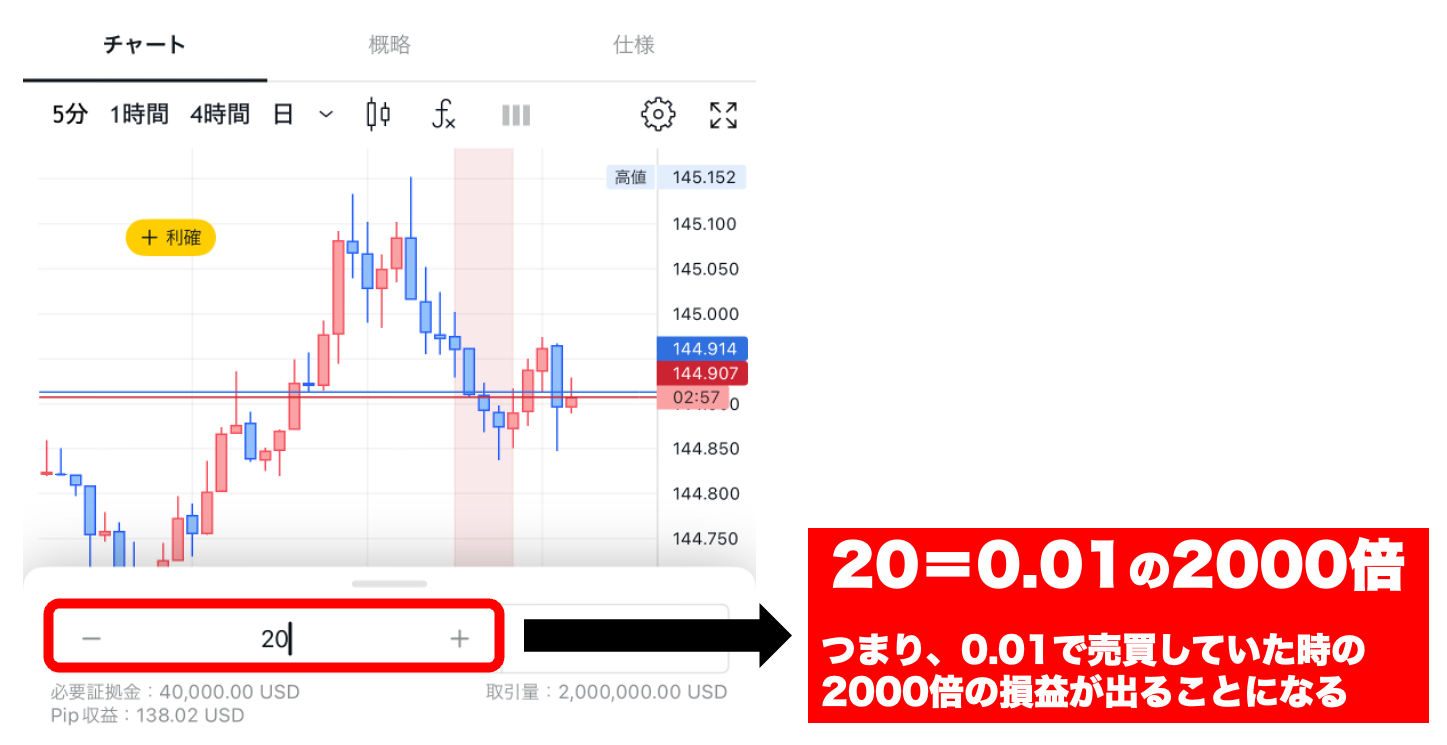 「20」は「0.01」の2000倍ですから、「0.01」でトレードした結果の損益が2000倍になります。