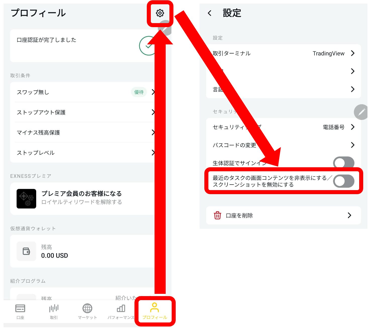 これはExness上でのセキュリティが原因のため、その設定をOFFに切り替えればスクリーンショットできるようになります。